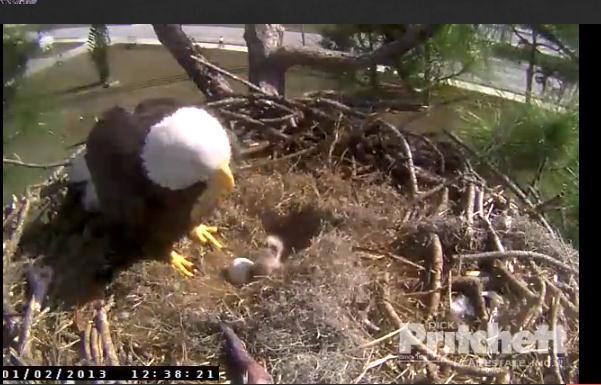 Quienes quieran apreciar la hora de la comida de mamá águila (HARRIET), cuando su pareja (Ozzie) le trae su comida (pescado fresco), les recomiendo en las primeras horas de la mañana (de 7:00 a 9:00 am EST, USA, aunque también lo hacen al final de la tarde